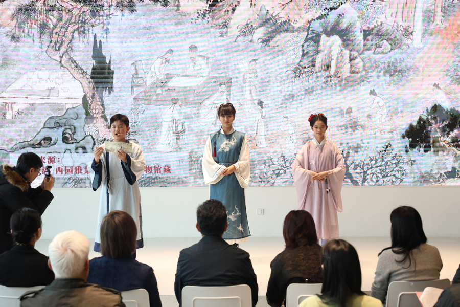 学生们演示古人雅礼——穿上古代服饰演绎画家石涛《西园雅集》。