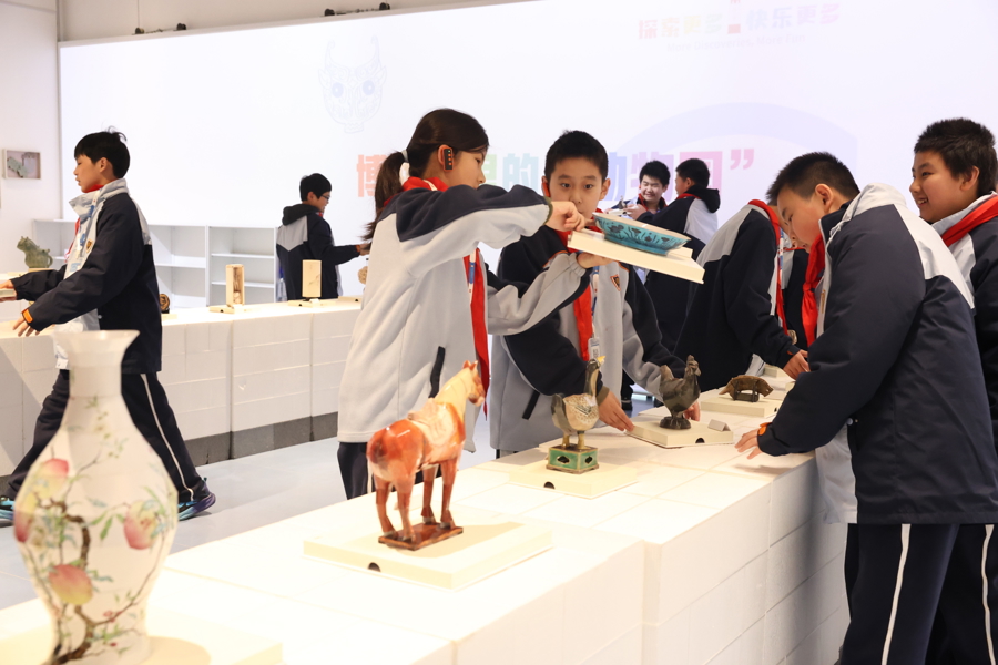 在老师的指导下,孩子们在体验模拟文物布展。